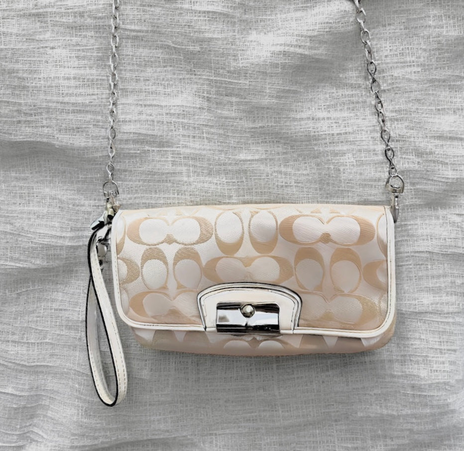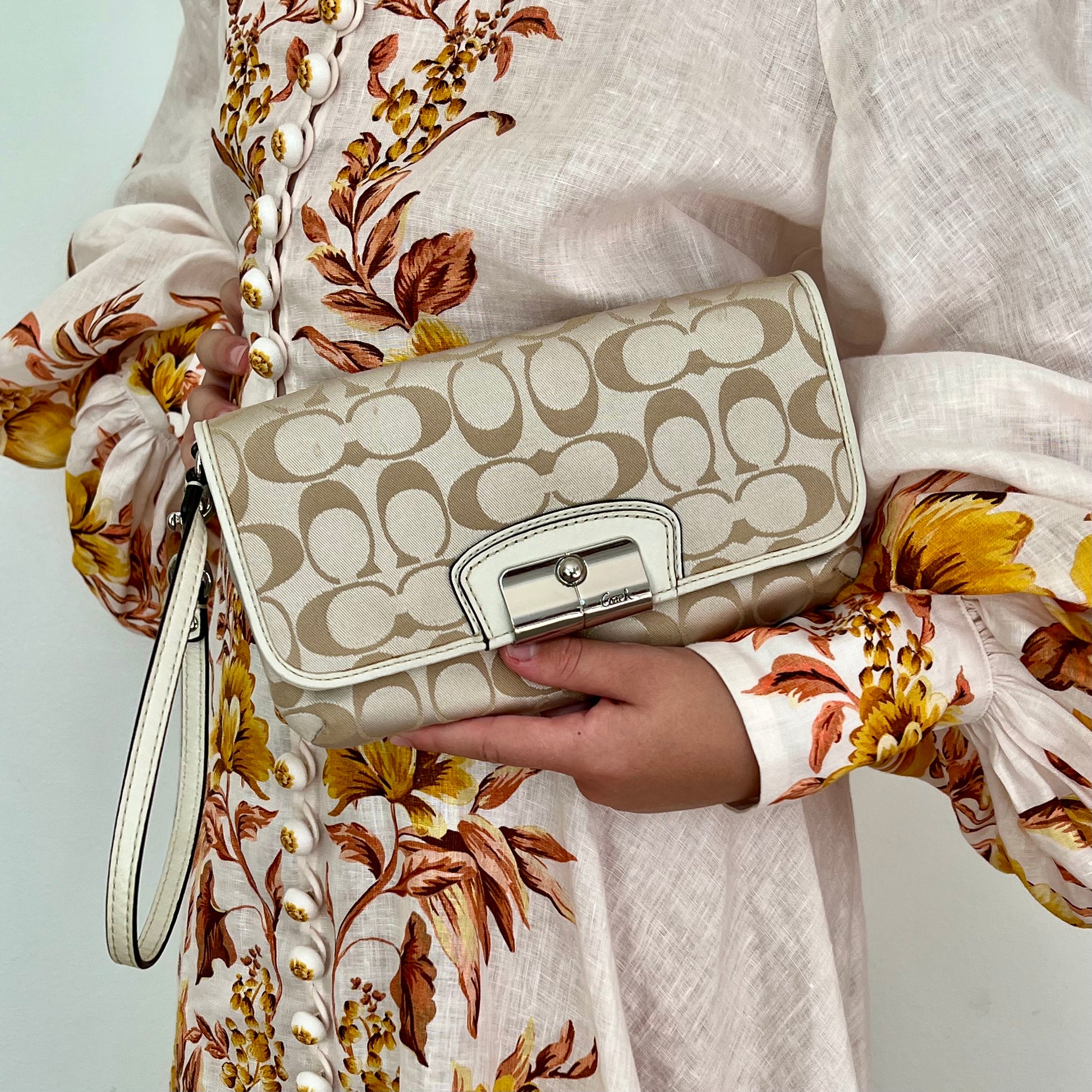 This Coach Signature Canvas bag is the perfect accessory for any look. Versatile as a clutch, or with a shoulder strap or chain, this neutral bag will suit any outfit. Make a statement when you step out with this sophisticated piece.