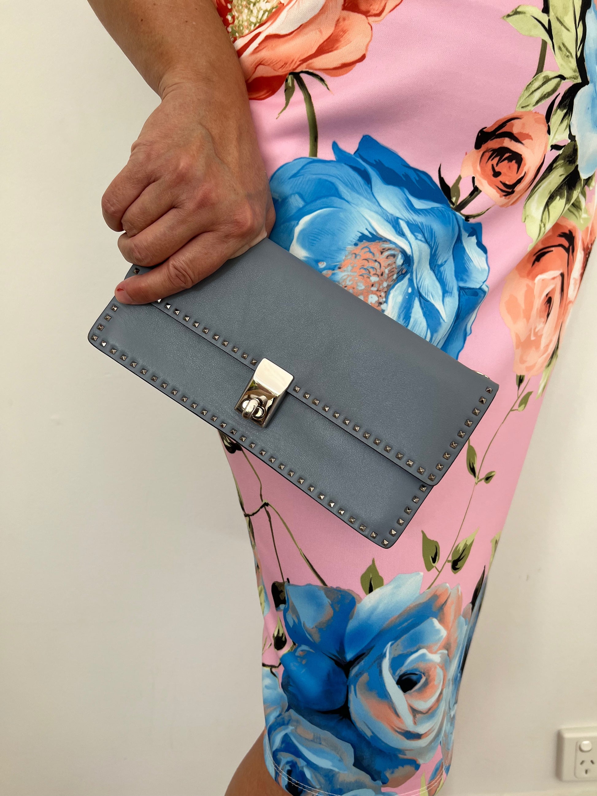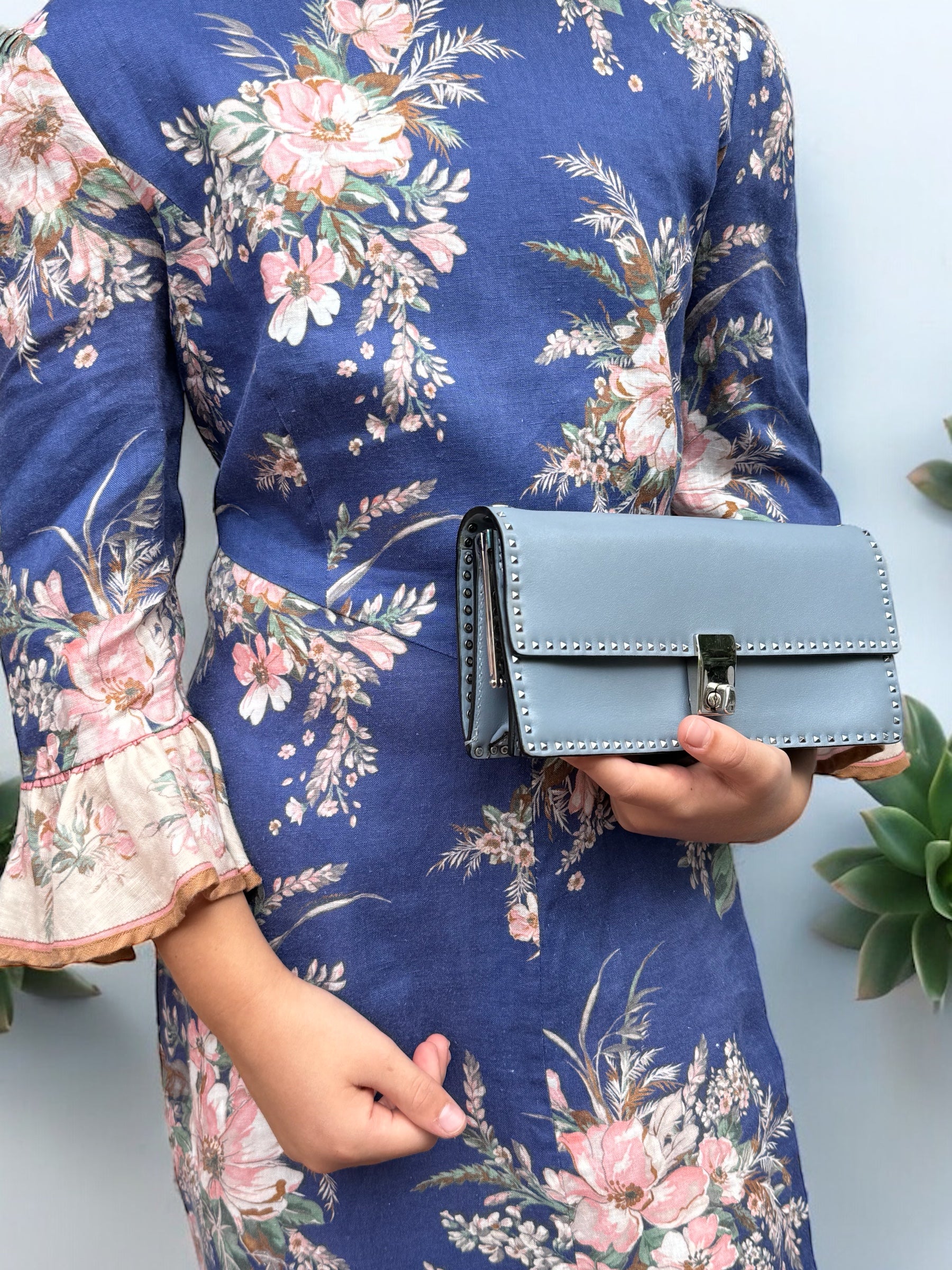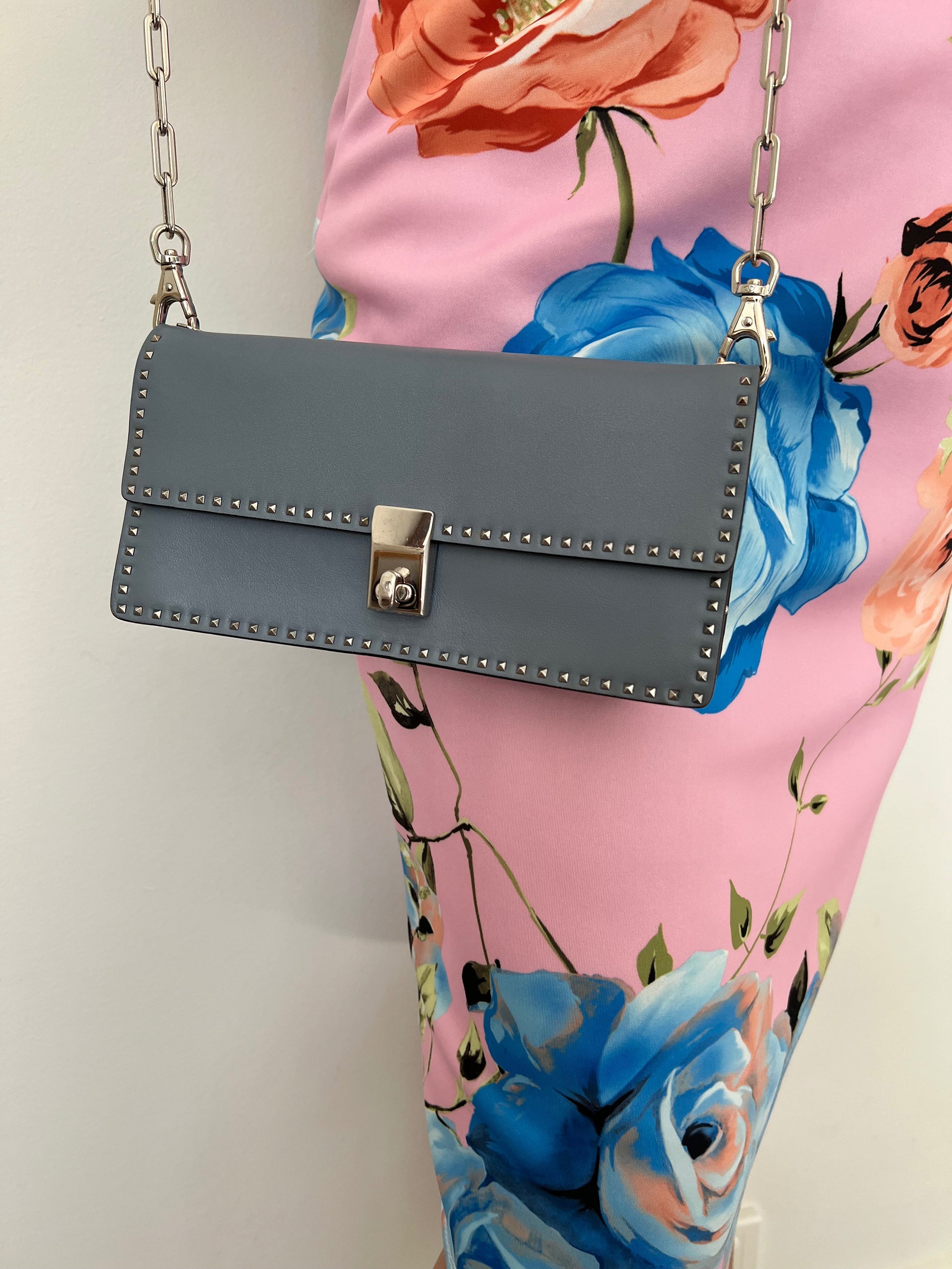 The Valentino Blue Calfskin Mini Rockstud Chain Clutch serves as an iconic fashion statement.